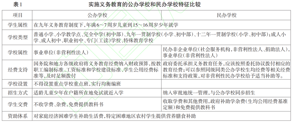 義務(wù)教育是國(guó)家依照法律規(guī)定對(duì)適齡兒童、少年實(shí)施的一定年限的強(qiáng)迫性免費(fèi)國(guó)民教育。《中華人民共和國(guó)義務(wù)教育法》(以下簡(jiǎn)稱《義務(wù)教育法》)規(guī)定,“義務(wù)教育是國(guó)家統(tǒng)一實(shí)施的所有適齡兒童、少年必須接受的教育,是國(guó)家必須予以保障的公益性事業(yè)”。公辦學(xué)校和民辦學(xué)校是實(shí)施義務(wù)教育的兩種主要學(xué)校形式,也是國(guó)家和非國(guó)家行為體通過政府和市場(chǎng)(社會(huì))提供公共教育服務(wù)的兩種基本機(jī)制(見表 1)。根據(jù)《中華人民共和國(guó)民辦教育促進(jìn)法》(以下簡(jiǎn)稱《民辦教育促進(jìn)法》)對(duì)民辦教育的概念界定,“國(guó)家機(jī)構(gòu)以外的社會(huì)組織或者個(gè)人,利用非國(guó)家財(cái)政性經(jīng)費(fèi),面向社會(huì)舉辦學(xué)校及其他教育機(jī)構(gòu)的活動(dòng),適用本法”;根據(jù)《義務(wù)教育法》規(guī)定“社會(huì)組織或者個(gè)人依法舉辦的民辦學(xué)校實(shí)施義務(wù)教育的,依照民辦教育促進(jìn)法有關(guān)規(guī)定執(zhí)行 ;民辦教育促進(jìn)法未作規(guī)定的,適用本法”。由此推斷,民辦義務(wù)教育是國(guó)家機(jī)構(gòu)以外的社會(huì)組織或個(gè)人,利用非國(guó)家財(cái)政性經(jīng)費(fèi),面向社會(huì)招收中小學(xué)生實(shí)施義務(wù)教育的活動(dòng)。從立法資源的使用來看,民辦教育立法所要解決的是特殊性問題,《民辦教育促進(jìn)法》屬于特殊法。按照《中華人民共和國(guó)民法典》“特別法優(yōu)于一般法”的法律適用原則,民辦學(xué)校實(shí)施義務(wù)教育的特別事項(xiàng),如設(shè)立、變更和終止,組織結(jié)構(gòu),財(cái)務(wù)管理,扶持與鼓勵(lì)以及監(jiān)督管理等執(zhí)行《民辦教育促進(jìn)法》,而《中華人民共和國(guó)教育法》和《義務(wù)教育法》等關(guān)于教育活動(dòng)的原則、教育者和受教育者的權(quán)利和義務(wù)、各類教育的基本制度和要求等都適用于民辦學(xué)校。