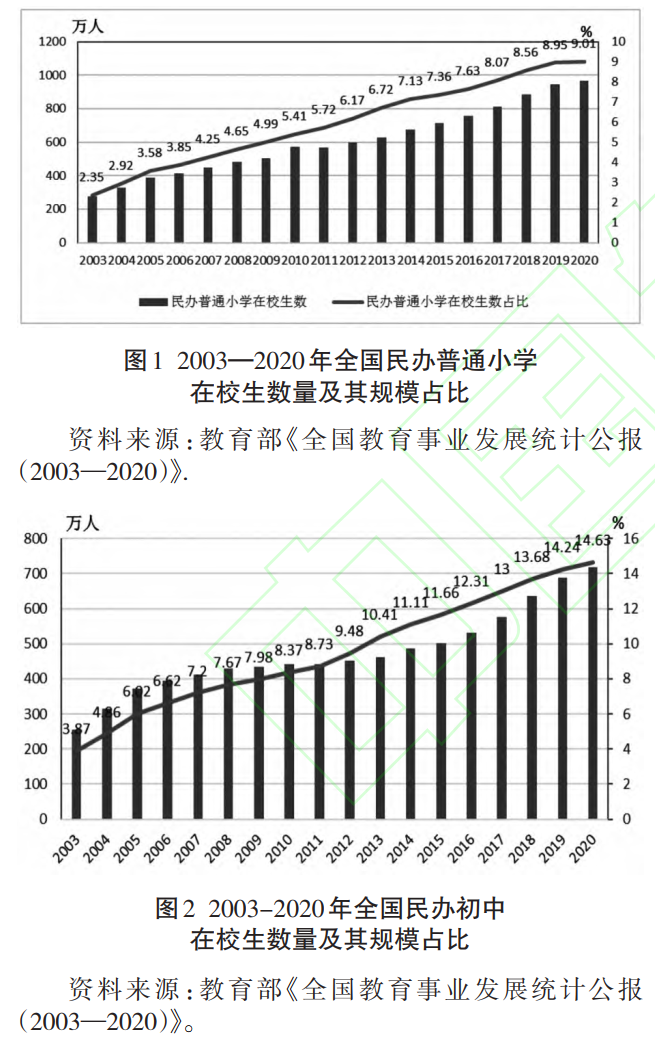 2003—2020 年,全國(guó)民辦普通小學(xué)在校生數(shù)從 274.93 萬人增加到 966.03 萬人,占全國(guó)普通小學(xué)在校生總數(shù)的比例從 2.35%提高到 9.01%,在校生平均規(guī)模從 484 人增加到1 561 人;全國(guó)民辦初中(包括普通初中和職業(yè)初中)在校生數(shù)從 258.85 萬人增加到 718.96萬人,占全國(guó)初中在校生總數(shù)的比例從 3.83%提高到 14.63%,在校生平均規(guī)模從 699 人增加到 1 190 人。這種格局變化反映了人民群眾對(duì)教育需求的多樣化程度。由民辦學(xué)校實(shí)施義務(wù)教育意味著公共教育服務(wù)責(zé)任部分地從政府向市場(chǎng)轉(zhuǎn)移;并且民辦義務(wù)教育學(xué)校在校生數(shù)和平均規(guī)模均大幅度增長(zhǎng),表明民辦義務(wù)教育發(fā)展策略以規(guī)模增長(zhǎng)為主 。