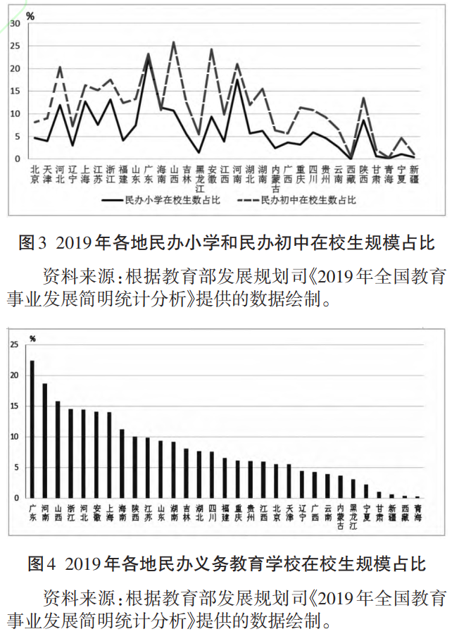 我國(guó)民辦義務(wù)教育發(fā)展具有明顯的地域不均衡性,呈現(xiàn)出不同的情況。義務(wù)教育階段民辦學(xué)校的大量出現(xiàn),通常是因?yàn)榈胤焦藏?cái)政不足導(dǎo)致公辦學(xué)校學(xué)位供給不足,或者是當(dāng)?shù)毓k學(xué)校的教育質(zhì)量不高或因條件限制不能提供特定服務(wù),或者是外來流入人口較多的地區(qū)因公辦學(xué)校提供的學(xué)位不足。現(xiàn)有民辦義務(wù)教育學(xué)校大致分為兩種類型:一種是為滿足具有一定經(jīng)濟(jì)基礎(chǔ)家庭的差異性教育需求的民辦學(xué)校,來自這些家庭的學(xué)生自愿放棄公辦學(xué)校入學(xué)機(jī)會(huì);另一種主要是收納進(jìn)城務(wù)工人員隨遷子女的民工子弟學(xué)校,滿足其無法進(jìn)入公辦學(xué)校就讀的過度性教育需求。民辦義務(wù)教育在校生占比存在顯著的地區(qū)差異,占比較高的地區(qū)主要集中在東部(廣東、浙江、上海等)和中部(河北、河南、山西、安徽等)部分地區(qū)(見圖 3、圖 4)。以廣東省為例,外來人口數(shù)量全國(guó)最多,本地公辦教育資源一時(shí)難以滿足快速增加的學(xué)位需求,使其成為全國(guó)民辦義務(wù)教育規(guī)模最大的省份。2019 年,全省民辦小學(xué)和民辦初中在校生數(shù)分別達(dá)到 228.55 萬人和 90.41 萬人,分別占全省小學(xué)和初中在校生總數(shù)的 22.12%和 23.24%,民辦義務(wù)教育在校生數(shù)合計(jì)占全省義務(wù)教育在校生總數(shù)的 22.42%。同年,全省小學(xué)和初中進(jìn)城務(wù)工人員隨遷子女在校生總數(shù)達(dá)到 329.34 萬人,占全國(guó)總量的 23.08%,其中外省遷入 178.38 萬人。廣東省不得不通過民辦學(xué)校解決學(xué)位供給不足問題。再如重慶市,截至 2020 年年底,全市民辦義務(wù)教育學(xué)校 148 所,在校生 20.04 萬人,占全市義務(wù)教育學(xué)校在校生人數(shù)的 6.3%。其中,民辦小學(xué) 69 所,在校生 7 萬人,占全市小學(xué)在校生人數(shù)的 3.5%;民辦初中 79 所,在校生 13.04 萬人,占全市初中在校生人數(shù)的 11.3%。全市25 所公辦中小學(xué)共參與舉辦了 48 所民辦學(xué)校即“公參民”學(xué)校,在校生 10.23 萬人,占全市民辦義務(wù)教育在校生總數(shù)的一半以上。從區(qū)域分布看,主城都市區(qū)中心城區(qū)民辦義務(wù)教育學(xué)校 41 所,在校生 9.38 萬人,占全市民辦義務(wù)教育學(xué)校在校生總數(shù)的 46.8%;主城都市區(qū)主城新區(qū) 45 所,在校生 6.66 萬人,占全市民辦義務(wù)教育學(xué)校在校生總數(shù)的 33.2%,民辦義務(wù)教育發(fā)展增加了義務(wù)教育資源供給,尤其滿足了城區(qū)不同家庭對(duì)義務(wù)教育的差異化方面的需求。