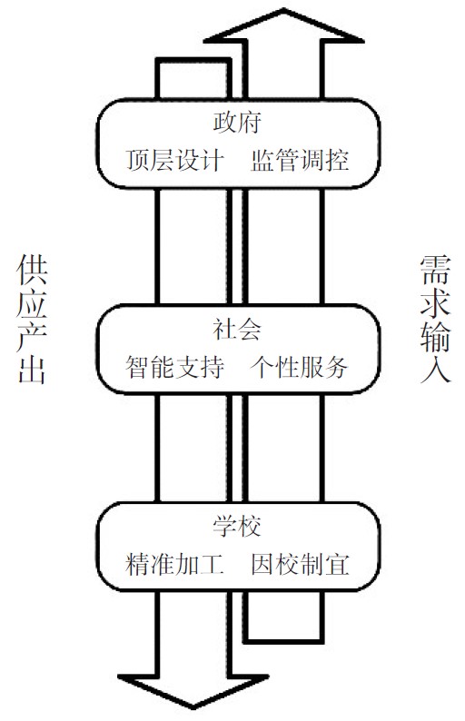 過去,政府作為教育服務(wù)供給的主體,其重點(diǎn)是確保教育服務(wù)的普及化和均衡化,旨在滿足多數(shù)人的標(biāo)準(zhǔn)化需求,因此不得不忽視和淡化少數(shù)人的個(gè)性化需求。由于過度強(qiáng)調(diào)政府主導(dǎo)作用,社會(huì)力量參與教育服務(wù)供給困難重重,特色化和差異化的教育服務(wù)明顯匱乏。在“互聯(lián)網(wǎng)+”時(shí)代,知識(shí)觀發(fā)生了深刻變化,呈現(xiàn)出信息貢獻(xiàn)草根化、信息生產(chǎn)眾籌化、聯(lián)結(jié)關(guān)系網(wǎng)絡(luò)化等新特征(陳麗等,2019),人人都是信息的接收者和提供者,這為社會(huì)力量進(jìn)入教育鋪平了道路。未來,教育服務(wù)將從“標(biāo)準(zhǔn)供給”走向“需求供給”,形成政府、學(xué)校和社會(huì)“三位一體”的教育服務(wù)供給鏈(如圖1所示)。其中,政府作為教育服務(wù)供給的主導(dǎo)力量,通過政策設(shè)計(jì)對(duì)服務(wù)供給全過程進(jìn)行宏觀調(diào)控和科學(xué)監(jiān)管。社會(huì)是教育服務(wù)供給的新生力量,重點(diǎn)是將先進(jìn)教育理念轉(zhuǎn)化為優(yōu)質(zhì)教育服務(wù),推動(dòng)校內(nèi)外教育場(chǎng)景互聯(lián)。學(xué)校是教育服務(wù)供給的關(guān)鍵載體,根據(jù)師生需求精準(zhǔn)加工教育服務(wù),使教育服務(wù)與師生發(fā)展相契合。