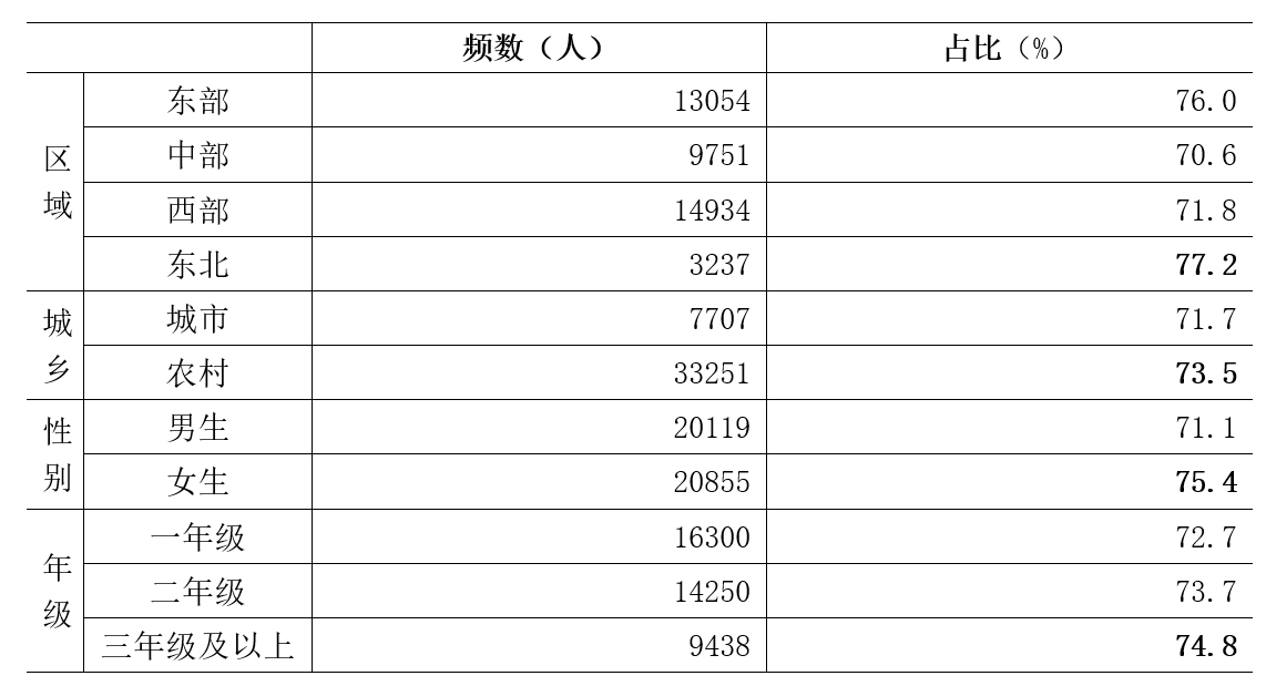 交往能力既是青少年健康成長的關(guān)鍵素養(yǎng)和生存技能,也是協(xié)調(diào)組織關(guān)系和形成集體合力的核心紐帶。研究發(fā)現(xiàn),當(dāng)前中職學(xué)生尤其是生生之間的交往能力在持續(xù)提高。當(dāng)前中職學(xué)生在生生交往方面較2017年調(diào)查結(jié)果(72.3%)而言,提升了0.9個(gè)百分點(diǎn)。在區(qū)域方面,東北地區(qū)學(xué)生人際交往滿意比例最高;城鄉(xiāng)方面,農(nóng)村學(xué)生滿意比例高于城市;性別方面,女生滿意比例明顯高于男生;年級(jí)方面,三年級(jí)及以上的學(xué)生滿意比例較高(表4)。此外,研究還發(fā)現(xiàn),中職