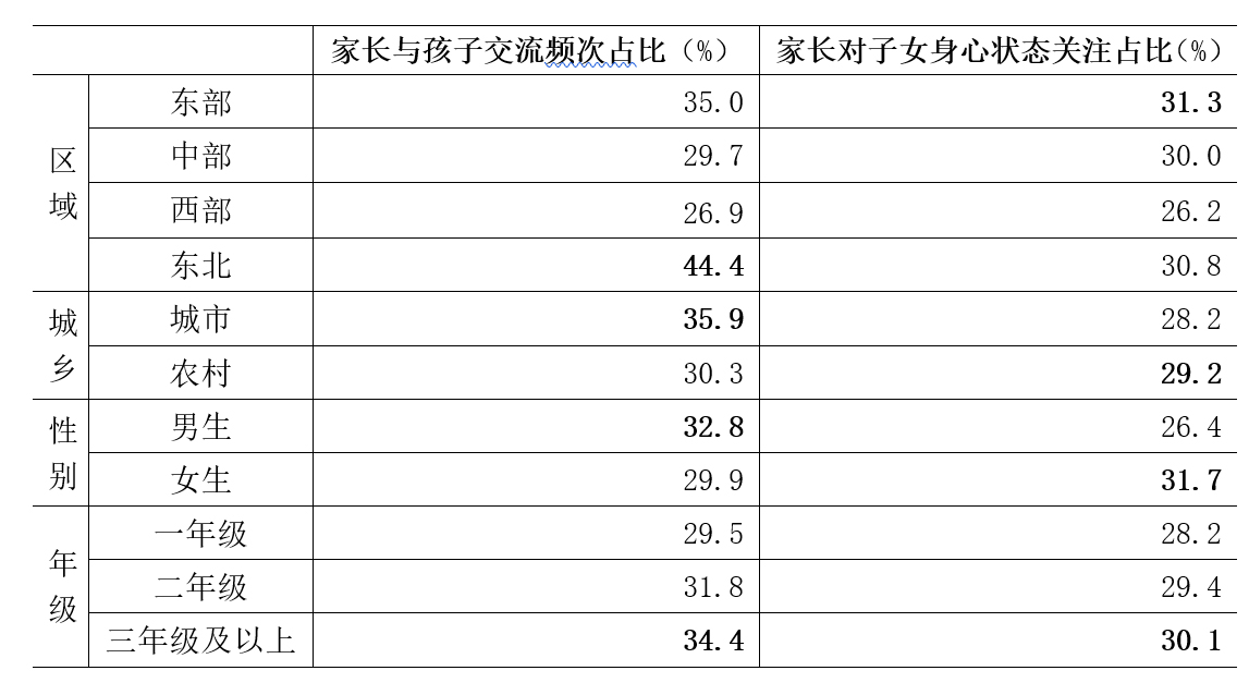 家庭是孩子的第一所學(xué)校,父母是孩子的第一任老師。家庭是培養(yǎng)孩子健康心靈、養(yǎng)成道德行為的重要場(chǎng)域,家庭教育是教育和培養(yǎng)人的基點(diǎn)。家庭教育與學(xué)校教育、社會(huì)教育都是教育系統(tǒng)的重要組成部分,良好的家庭教育既是兒童青少年健康幸福成長的基礎(chǔ),也是培養(yǎng)德智體美勞全面發(fā)展的社會(huì)主義建設(shè)者和接班人的基石。可見,家庭德育環(huán)境對(duì)青少年德性的養(yǎng)成至關(guān)重要。研究發(fā)現(xiàn),家長與子女有效溝通交流頻次增多,學(xué)生能夠經(jīng)常和家長說心里話的比例上升,較2017年調(diào)查(30.5%)提高了0.9個(gè)百分點(diǎn)。在區(qū)域方面,東北地區(qū)學(xué)生與父母溝通交流的比例最高;在城鄉(xiāng)方面,城市學(xué)生與父母溝通交流的比例明顯高于農(nóng)村;在性別方面,男生與父母溝通交流的比例明顯高于女生;在年級(jí)方面,三年級(jí)及以上的學(xué)生與父母溝通交流的比例最高,并且年級(jí)因素與溝通交流頻次之間呈正相關(guān)性(表5)。不僅如此,家長對(duì)孩子教育的關(guān)注點(diǎn)總體上也有了較好的轉(zhuǎn)變,依次排序?yàn)樯硇臓顟B(tài)(29.0%)、學(xué)習(xí)成績(27.4%)、衣食住行(18.6%)、道德品行(17.1%)和就業(yè)前景(6.7%)。由此可見,身心健康逐漸成為家長的首要關(guān)注點(diǎn)。在區(qū)域方面,東部地區(qū)家長關(guān)注子女身心狀態(tài)的比例最高;在城鄉(xiāng)方面,農(nóng)村家長關(guān)注子女身心狀態(tài)的比例略高于城市;在性別方面,女生家長關(guān)注子女身心狀態(tài)的比例明顯高于男生;在年級(jí)方面,三年級(jí)及以上的家長關(guān)注子女身心狀態(tài)的比例相對(duì)較高(表5)。隨著國家經(jīng)濟(jì)高質(zhì)量持續(xù)發(fā)展、科學(xué)技術(shù)日