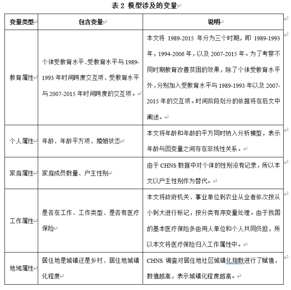 本文的數(shù)據(jù)來(lái)源于中國(guó)健康營(yíng)養(yǎng)調(diào)查(以下簡(jiǎn)稱CHNS),經(jīng)過(guò)各個(gè)屬性的重新組合,最終確定的樣本數(shù)量為46921,時(shí)間跨度為1989—2015年,覆蓋的省份包括北京、上海、江蘇、山東、遼寧、黑龍江、河南、湖南、湖北、貴州、廣西、重慶。由于北京、上海和重慶三個(gè)直轄市在2011年才加入該項(xiàng)調(diào)查,為了保留盡可能多的樣本,本文使用的是非平衡面板數(shù)據(jù)。