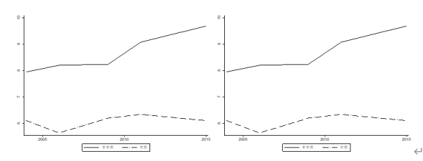 2004—2015年,非貧困人口受教育水平總體呈現(xiàn)逐漸上升的趨勢(shì),而貧困人口受教育水平變化幅度較為微弱。隨著時(shí)間的變化,無(wú)論是以絕對(duì)貧困(見圖 1 左圖)還是相對(duì)貧困(見圖1右圖)劃分,貧困與非貧困兩個(gè)群體受教育水平?jīng)]有出現(xiàn)收斂的現(xiàn)象,而是都呈現(xiàn)出分化的趨勢(shì)。