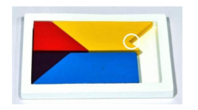由于四巧板的設(shè)計中巧妙地針對了人們形象思維中對不規(guī)則圖形的認(rèn)知盲區(qū),很多人會依循固有的思維定式,忽略對圖中黃色組塊凹陷部位的觀察,而只是計數(shù)其它三塊組塊的直角,認(rèn)為一共有5個。
