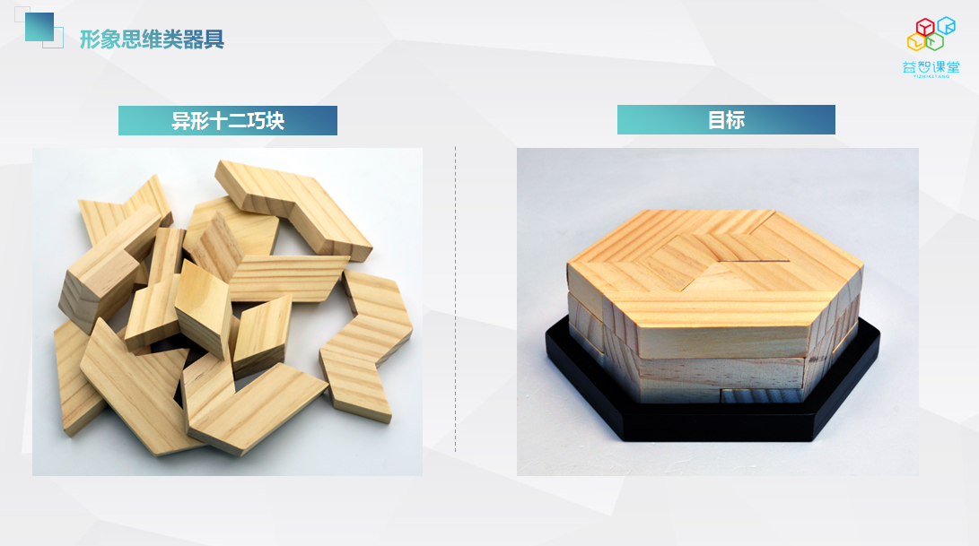 而高年級(jí)時(shí),在形象思維訓(xùn)練的后期,器具難度大幅增加,無論是組塊數(shù)量還是結(jié)構(gòu)都愈趨增多、復(fù)雜,其中很多不規(guī)則立體圖形較難用語言進(jìn)行準(zhǔn)確描述,學(xué)生固然可以經(jīng)過分析提出拼組的整體策略,但在具體實(shí)施階段往往憑借長期形成的幾何直觀經(jīng)驗(yàn)進(jìn)行拼組。例如異形十二巧塊、神龍盤柱、復(fù)雜的魯班鎖等等。學(xué)生經(jīng)常能夠成功完成拼組,卻無法說清其中的具體方法。這一階段是獲取思維經(jīng)驗(yàn)的高級(jí)階段,由于長期、大量接觸復(fù)雜圖形,并進(jìn)行高難度的形象思維活動(dòng),大腦對(duì)圖形結(jié)構(gòu)的認(rèn)知方式和能力水平已經(jīng)發(fā)生質(zhì)的變化,處理圖形信息的自動(dòng)化功能得到增強(qiáng),經(jīng)驗(yàn)經(jīng)過沉淀初步形成了較為準(zhǔn)確的“幾何直觀”能力。