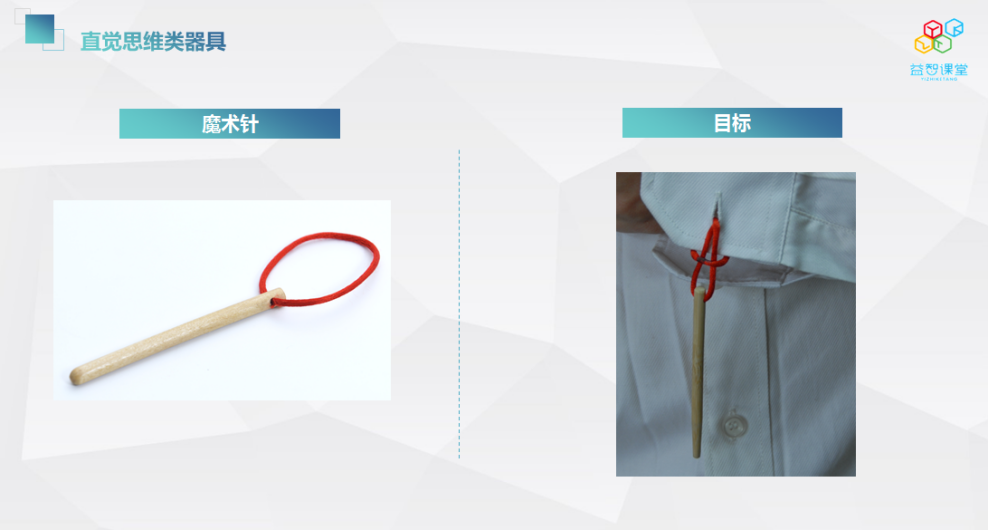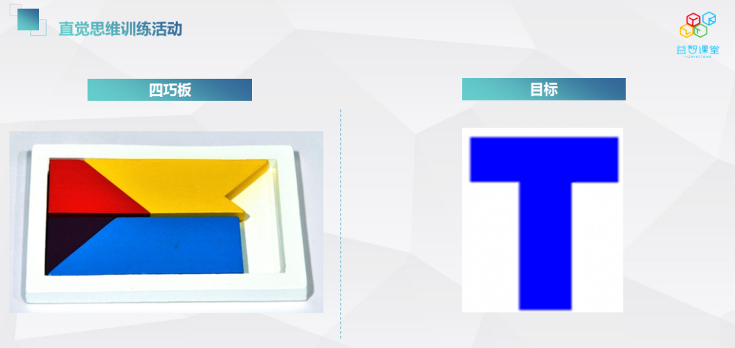 在思維訓(xùn)練器具體系中,存在很多直接針對(duì)直覺思維的器具,如“雙馬雙騎士”、“魔術(shù)針”等,也有部分形象思維和邏輯思維的器具可以設(shè)計(jì)出適合頓悟的教學(xué)活動(dòng),如“博士板”的拼“T”活動(dòng)和“九宮圖”等。